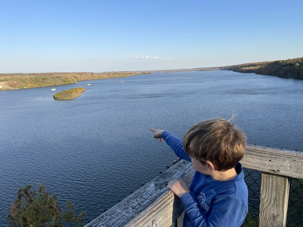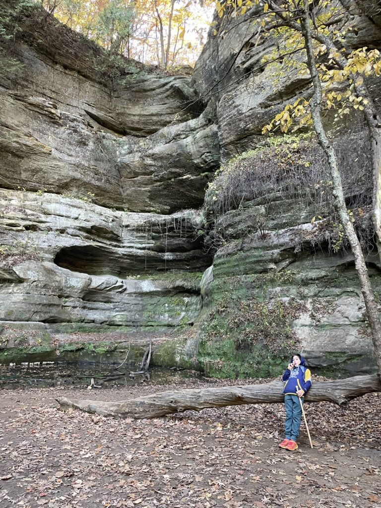 Il a été décidé d’aller explorer le state park à proprement dit. Il fallait donc se rendre 2 miles plus loin pour accéder aux sentiers. Nous avons marché, beaucoup. Nous en avons profité pour parcourir les sentiers en bordure de la rivière Illinois. Il faut préciser que « river » et « river » est le même terme en anglais. Cependant, en français, nous différencions « rivière » et « fleuve ». Je vous le confirme : l’Illinois est un fleuve. Starved Rock est réputé pour ses canyons que nous avons exploré et l’immense monticule de pierre. C’est sur ce monticule que De Lasalle a construit le premier fort de l’Illinois.